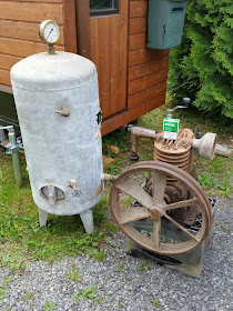 Manometrin kyljessä JDN tarra. Tarkoittaa JD Neuhausia, joka tekee paineilmataljoja. En edes muista mistä tämä tullut, mutta melko järeän ilmataljan kaverina ollut, lähdöt kolmevarttiset. Manometrin vieressä olevan vedenerottimen kokoinen öljystin oli toisella puolen kiinni. Sen jätin pois sillä yhtään enempää öljyä kaivata, wanhus sylkee tarpeeksi. Päädyssä on optioksi jätetty 3-vartin venttiili. Siitä kenties pienen ilmaverkoston ja pisteitä voisi tehdä "koneistus" seinän puolelle.